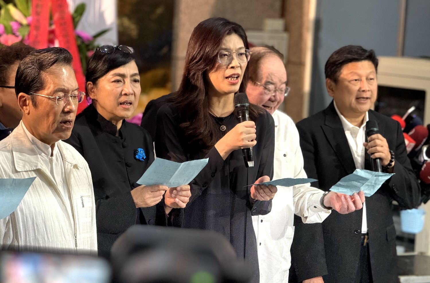 11月12日,中国国民党在台北举行活动纪念孙中山先生诞辰,该党主席郑丽文(中)出席并领唱纪念歌。(图片来源:中新社)