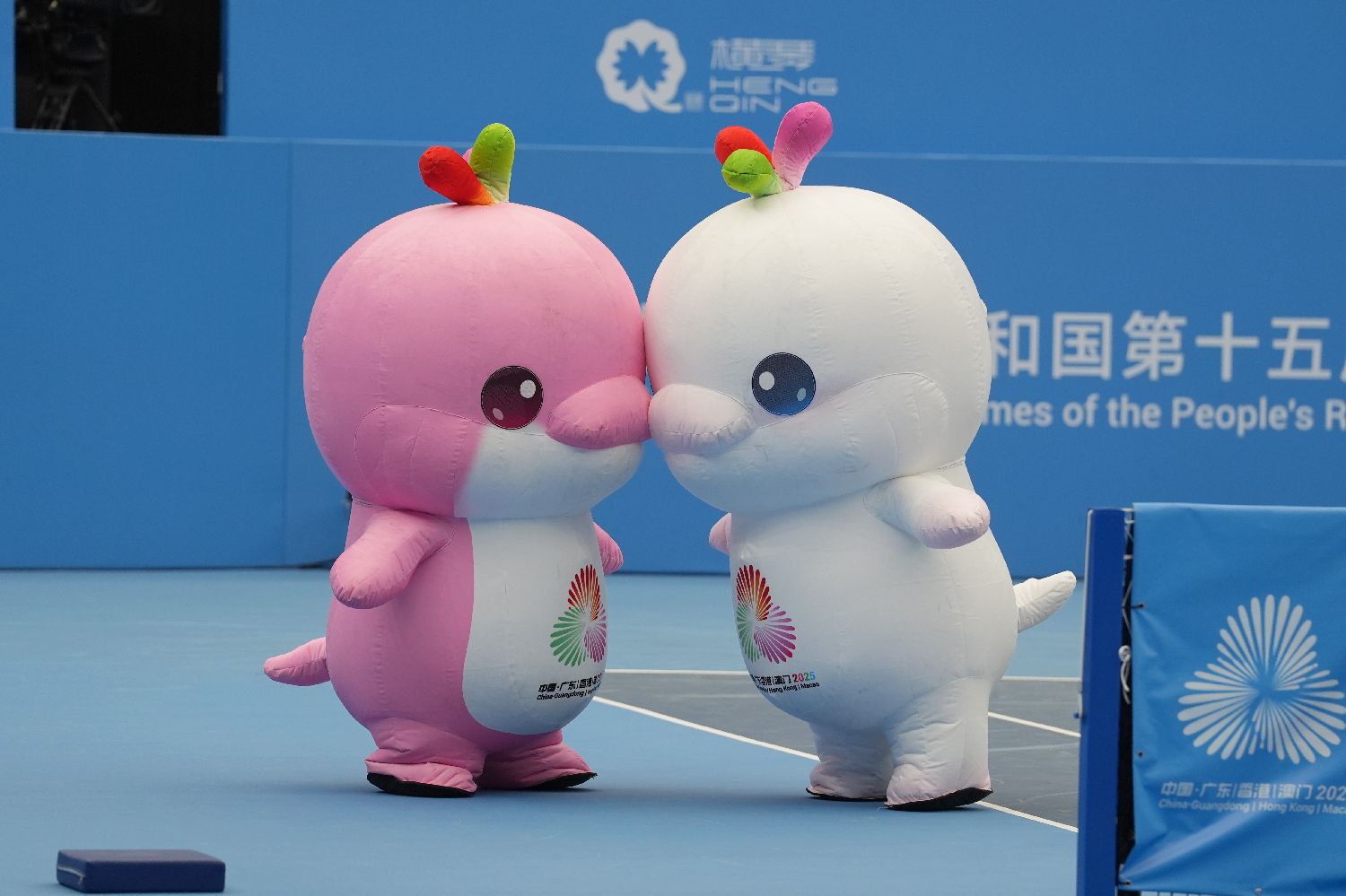 图为11月15日,第十五届全国运动会网球项目在广东珠海横琴国际网球中心进行,吉祥物“喜洋洋”和“乐融融”亮相现场。(图片来源:中新社)