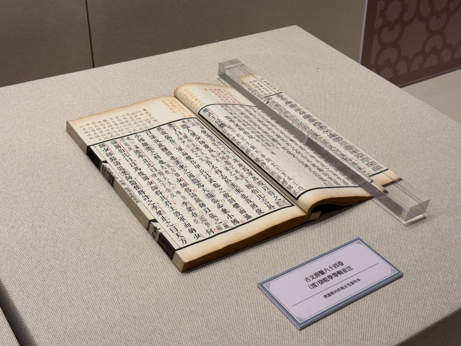 展览中,康熙年间五色套印的《古文渊鉴》引人注目。据介绍,清内府刊刻的套印本,用色丰富、套印精准,套版印刷技术有了进一步发展。五色套印的《古文渊鉴》正文用墨色印制,前人诸家评语分别以黄、绿、蓝三色套印,清朝注释评语则用朱色套印。其刷印精美、色彩明丽,显示出清初内府多色套印技术的较高水平,也是现知清内府较早套印版书籍。