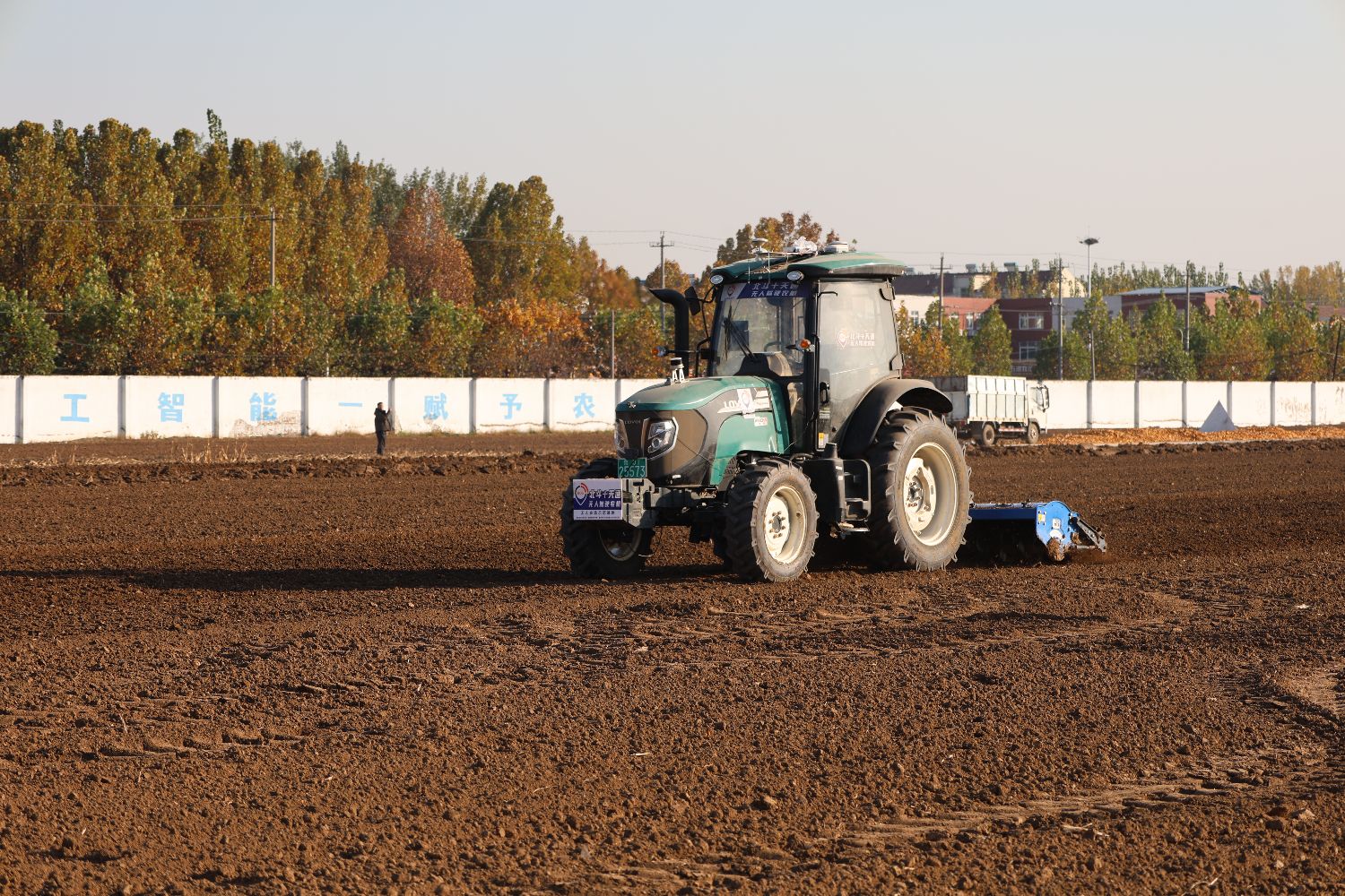 11月13日,山东省邹平市无人农场示范基地,无人驾驶旋耕机正在对土地进行翻土作业。(图片来源:中新社)