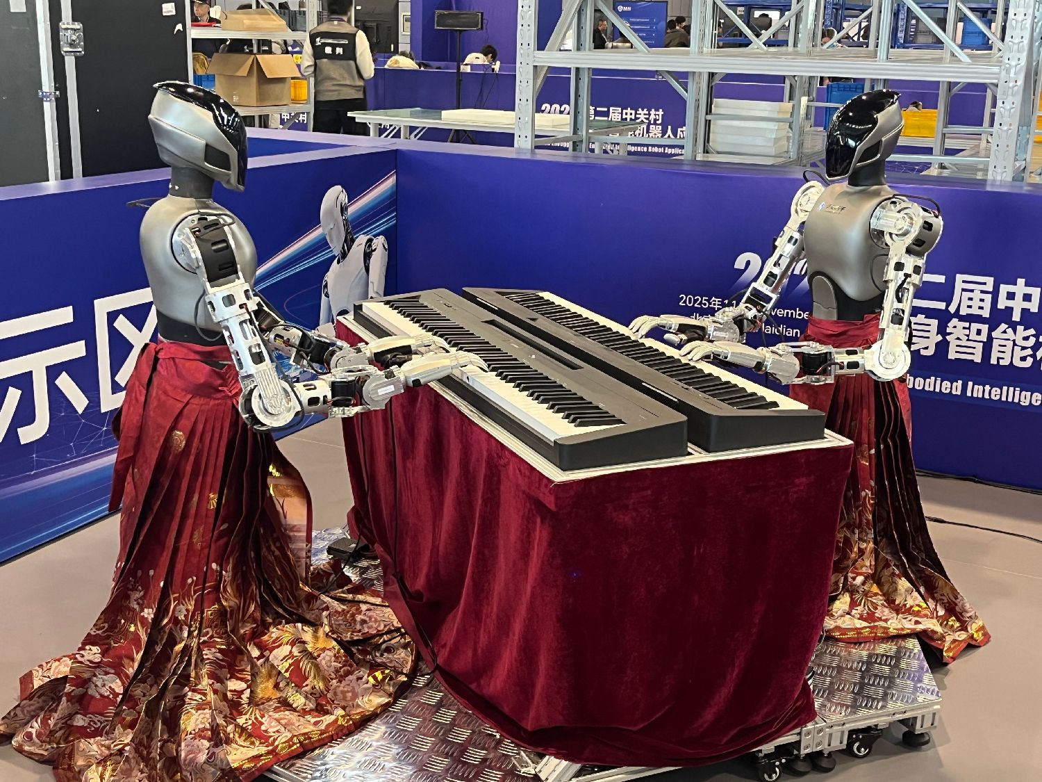 11月17日至18日,2025年第二届中关村具身智能机器人应用大赛决赛在北京举办。图为18日比赛现场的机器人演奏。(图片来源:中新社)