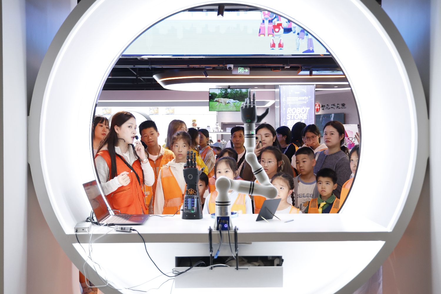 10月25日,浙江省少年儿童书画艺术大赛获奖儿童走进杭州文三未来科技体验中心,亲身体验“艺术+科技”的跨界魅力。图为儿童参观仿生机械臂和机械手。(图片来源:中新社)