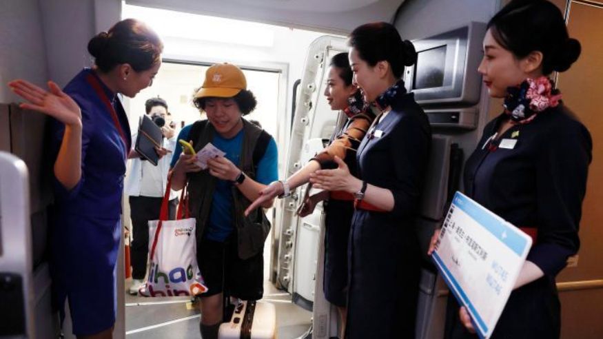 乘务员在登机口迎接旅客上机。(图片来源:中新网)