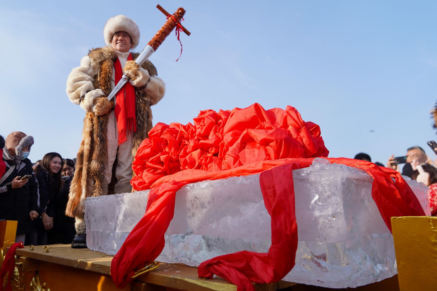 7日的采冰节,以“新形式”演绎了习俗。百名演员穿着传统采冰服饰跳起“采冰舞”,江面上鼓响旗扬,千人同唱“采冰号子”,尽显东北热血豪情。在“系鸿运”部分,象征吉祥的红绸由冰把头交给现场观众接力传递,象征薪火相传。“头冰”出水后,现场一起诵读《头冰颂》。