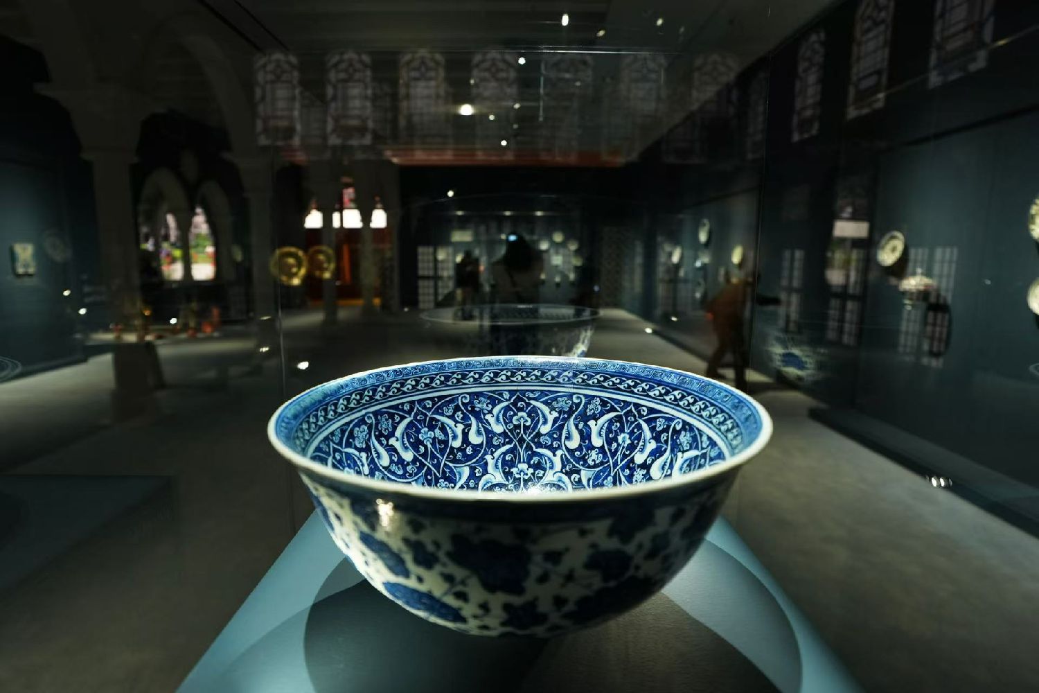 图案也是不同文化交流的见证。展厅里,一件17世纪萨法维王朝时期龙纹彩陶瓶对中国陶瓷原型进行了巧妙改造,展现出伊朗与中国文化的融合;另一件约1480年的土耳其中式纹饰盆,器壁装饰效仿元代青花瓷,其风格化的植物纹与中式花卉纹融为一体。